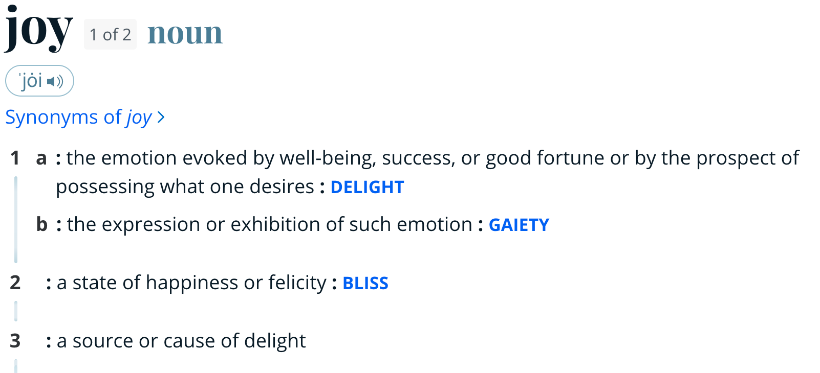 So the learning definition is not all that helpful, as someone who has spent more than 20 years obsessed with how humans learn, this definition leaves a lot to be desired. But one thing most of us know is that learning something new is not always easy. So on its face, learning seems to live in paradox with joy. If learning is hard, how can it be joyful? Isn’t joy fun and easy? Well, let’s look at that definition next: